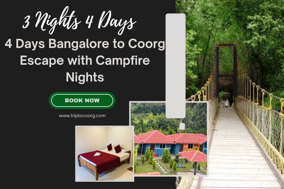 Experience the best of Coorg with this 4-day tour, exploring its breathtaking landscapes and cultural gems. Witness the beauty of Abbey Falls, Mandalpatti, and Irpu Waterfalls, and enjoy panoramic views from Raja’s Seat. Discover heritage at Raja’s Tomb, Triveni Sangama, and Bhagandeshwara Temple. Visit Talakaveri, the sacred source of the Kaveri River. Enjoy wildlife encounters at Nagarahole Tiger Reserve and Dubare Elephant Camp. Stroll through tea estates and Coffee Island Plantation, relax by Chiklihole Reservoir, Harangi Dam, and Nisargadhama, and explore the Golden Temple. End your trip with Coorg’s finest products. Book now at triptocoorg.com!
