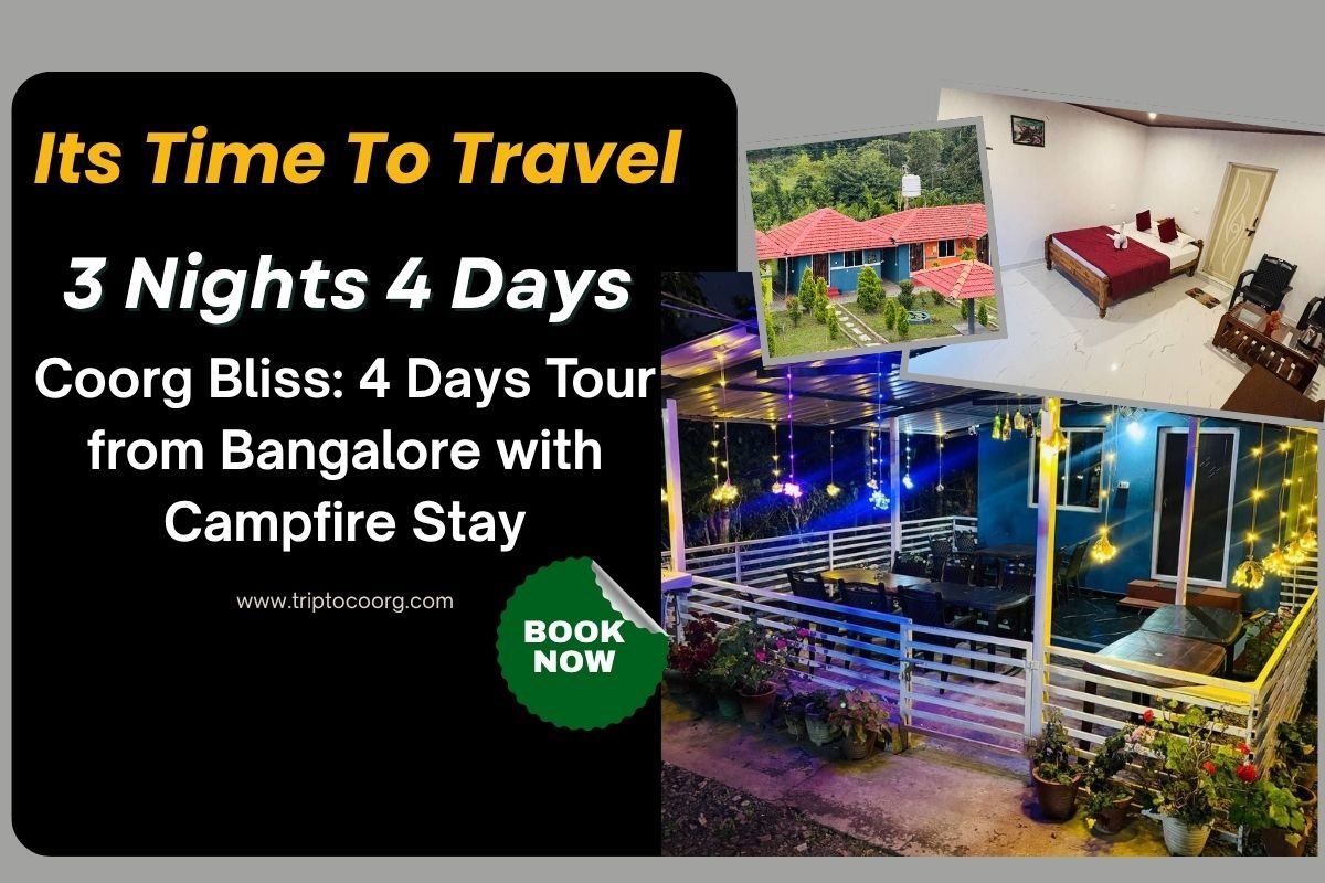 Experience the best of Coorg with this 4-day tour, exploring its breathtaking landscapes and cultural gems. Witness the beauty of Abbey Falls, Mandalpatti, and Irpu Waterfalls, and enjoy panoramic views from Raja’s Seat. Discover heritage at Raja’s Tomb, Triveni Sangama, and Bhagandeshwara Temple. Visit Talakaveri, the sacred source of the Kaveri River. Enjoy wildlife encounters at Nagarahole Tiger Reserve and Dubare Elephant Camp. Stroll through tea estates and Coffee Island Plantation, relax by Chiklihole Reservoir, Harangi Dam, and Nisargadhama, and explore the Golden Temple. End your trip with Coorg’s finest products. Book now at triptocoorg.com!